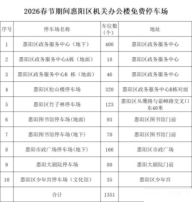 为切实解决市民春节期间出行停车难题,营造安全、有序、便利的节日环境,惠阳区委、区政府聚焦群众需求推出务实举措,2026年春节假期期间,该区将免费开放10处机关办公楼停车场,面向社会提供1351个公共停车位。